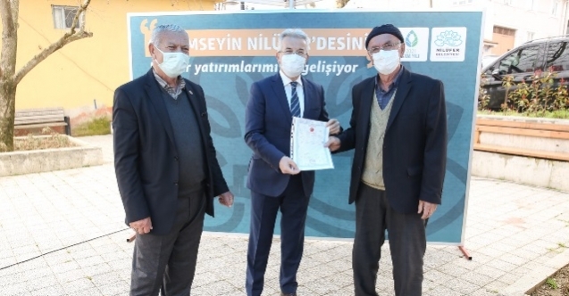 Konuşmaların ardından Nilüfer Belediye Başkanı Turgay Erdem, Gökçe Mahallesi Muhtarı Raif Alınca ile birlikte hak sahibine tapularını dağıttı.