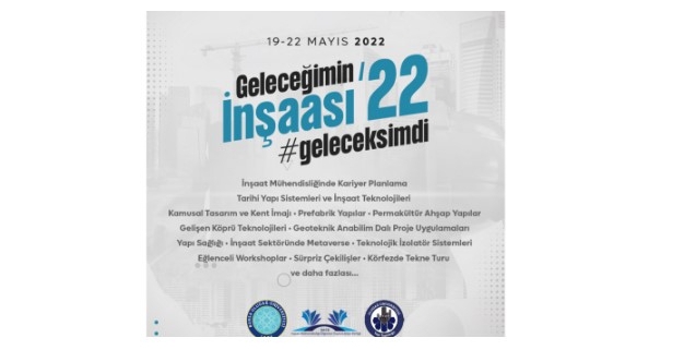 Etkinlikte; İnşaat Mühendisliğinde Kariyer Planlama, Tarihi Yapı Sistemleri ve İnşaat Teknolojileri, Kamusal Tasarım ve Kent İmajı, Prefabrik Yapılar, Permakültür Ahşap Yapılar, Gelişen Köprü Teknolojileri, Geoteknik Anabilim Dalı Proje Uygulamaları, Yapı Sağlığı, İnşaat Sektöründe Metaverse, Teknolojik İzolatör Sistemleri gibi konulara yer verilecek.