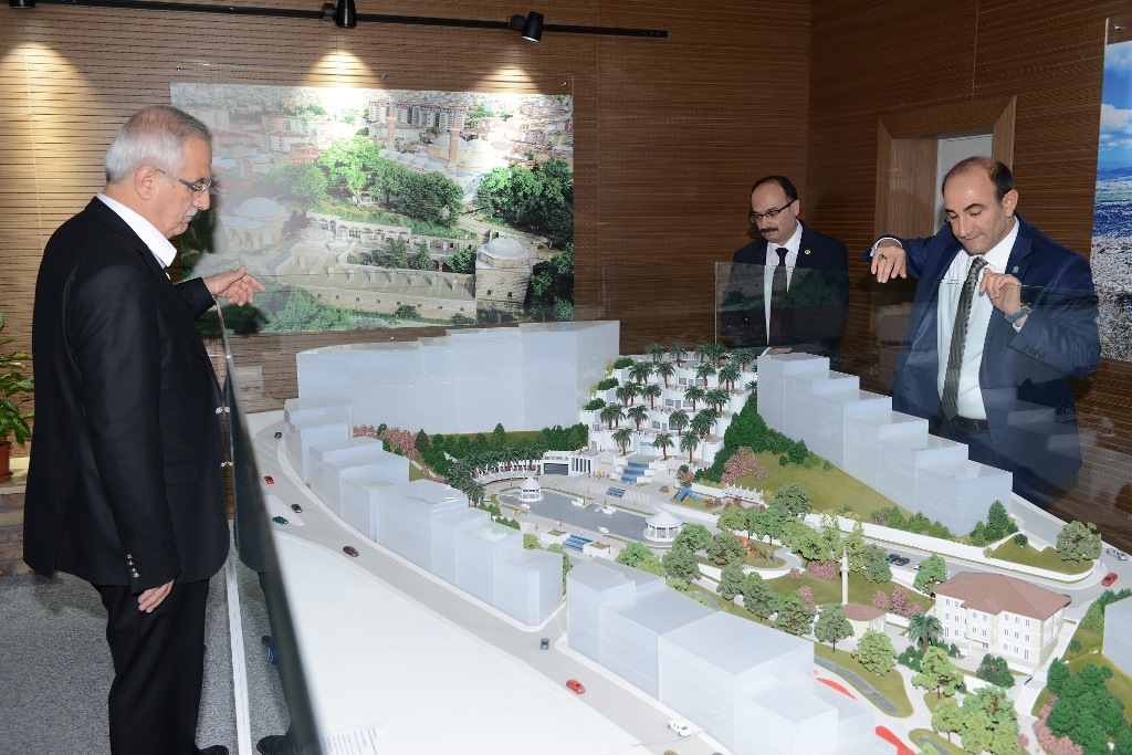 Yıldırım Belediye Başkanı İsmail Hakkı Edebali, kentsel dönüşümün mutfağı olarak nitelendirdiği Planlama ve Kentsel Gelişim Merkezi’nde ağırladığı AK Parti Bursa Milletvekilleri Muhammet Müfit Aydın ve Osman Mesten’e projelerini anlattı. Yıldırım’a modern bir şehir hüviyeti kazandıracak kentsel dönüşüm çalışmalarının ve vizyon projelerin hazırlandığı merkez hakkında bilgi veren Başkan İsmail Hakkı Edebali, “Hemşehrilerimizle kentsel dönüşüm çalışmalarımızı paylaşacağımız, Yıldırım Han Toplantı ve Konferans Salonu, dönüşüm projelerinin hazırlandığı Kentsel Tasarım birimi, AR-GE birimi ve Kalite Yönetim Temsilciliği bulunan merkezimiz ilçemizi ortak akılla yönetmemize zemin hazırlayacak” diye konuştu.