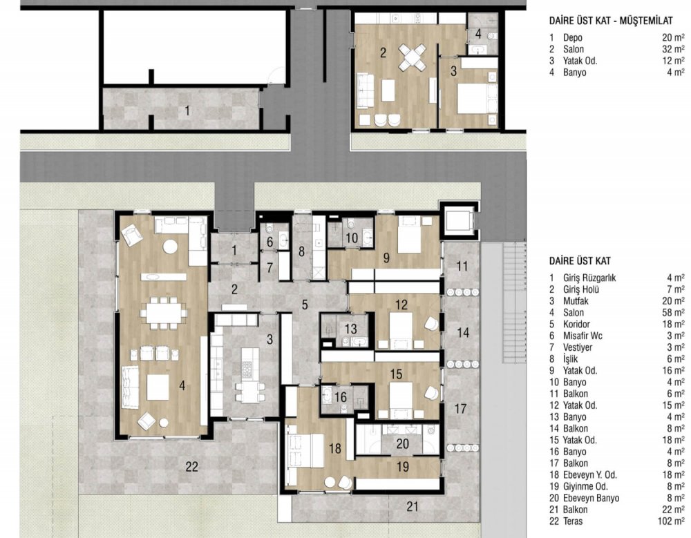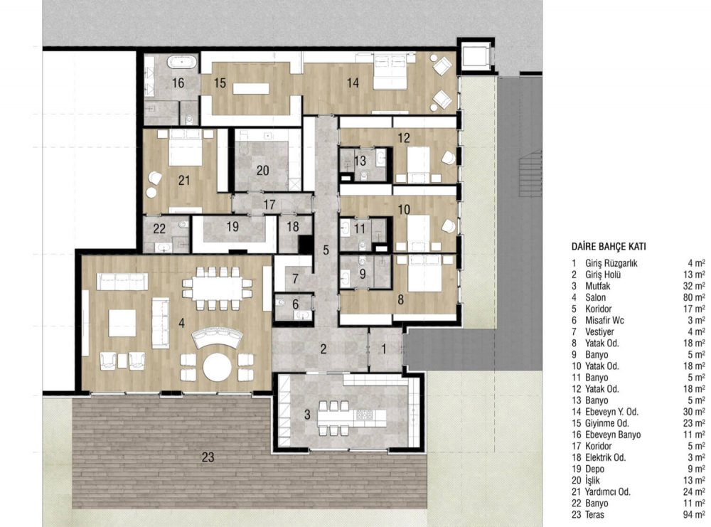 Geniş yaşam alanlarına sahip projede, 6 adet villa ve 12 adet daire tipi olmak üzere 18 bağımsız bölüm yer alıyor. Projedeki villalar, 3’er katlı olup net 924 metrekare kapalı alana sahip. 88 m2 net salon, 65 m2 net ebeveyn yatak odası, 50 m2 net mutfak gibi geniş kullanım alanları mevcut. Projenin daire bloklarımız ise alt bahçe katı ve üst bahçe katı daire olmak üzere 2 kattan oluşuyor. Net 400 metrekare kapalı alana sahip daireler, 80 m2 net salon,65 m2 net ebeveyn yatak odası ve 32 m2 net mutfak ile sahiplerini bekliyor.